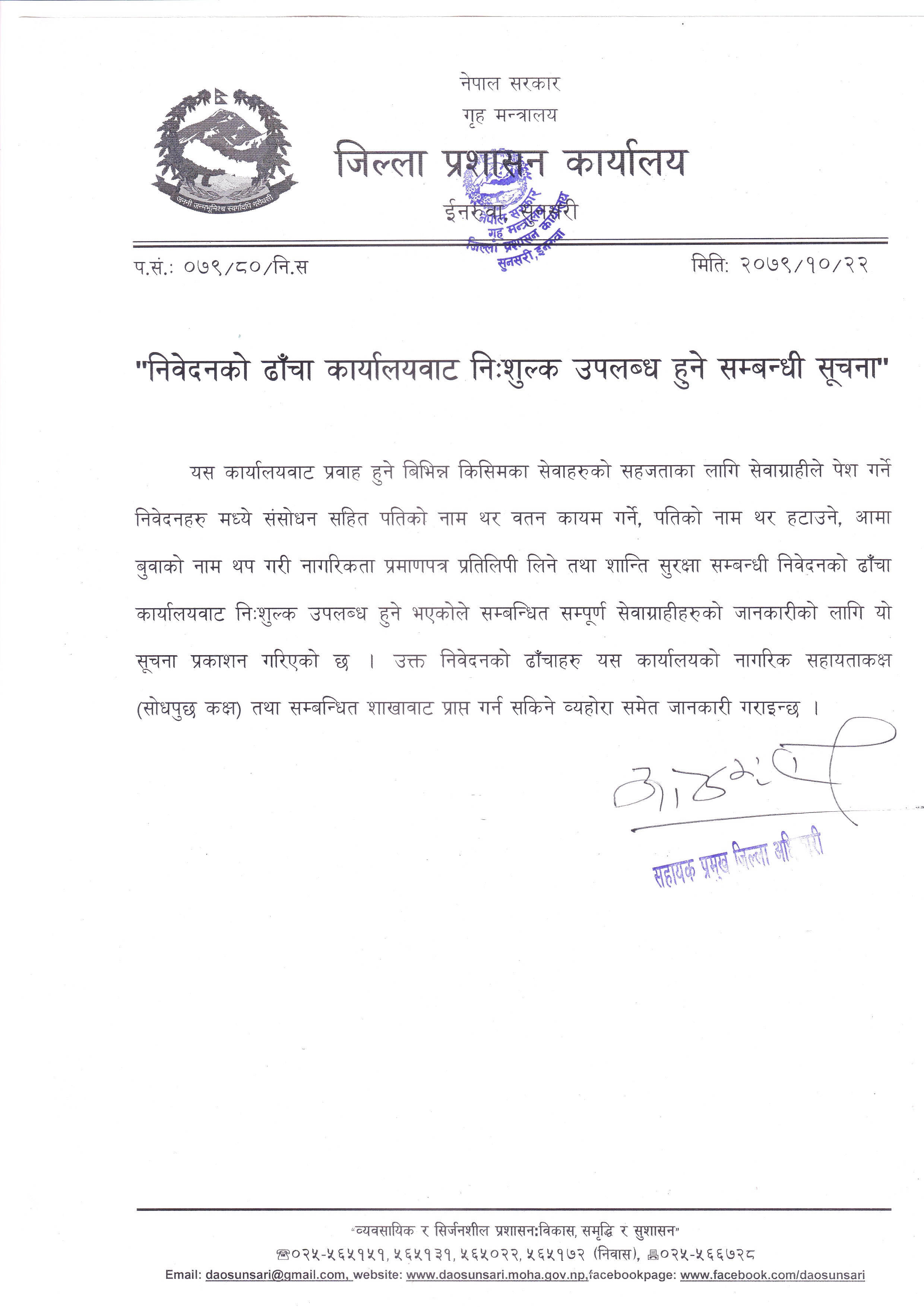 निवेदनको ढाँचा कार्यालयवाट निःशुल्क उपलब्ध हुने सम्बन्धी सूचना