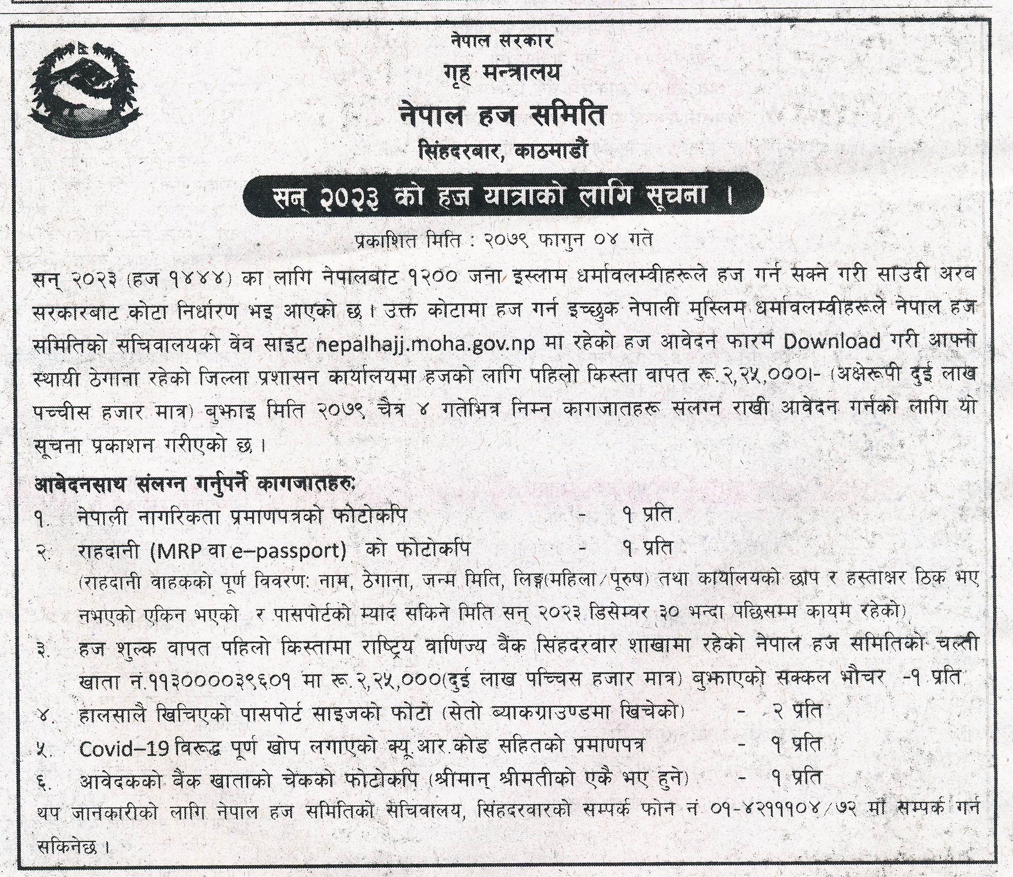 सन् २०२३ को हज यात्राको लागि सूचना ।