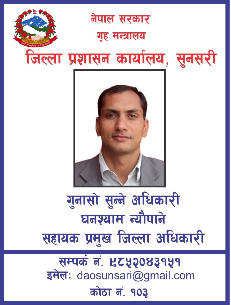 © सर्वाधिकार सुरक्षित जिल्ला प्रशासन कार्यालय, सुनसरी
