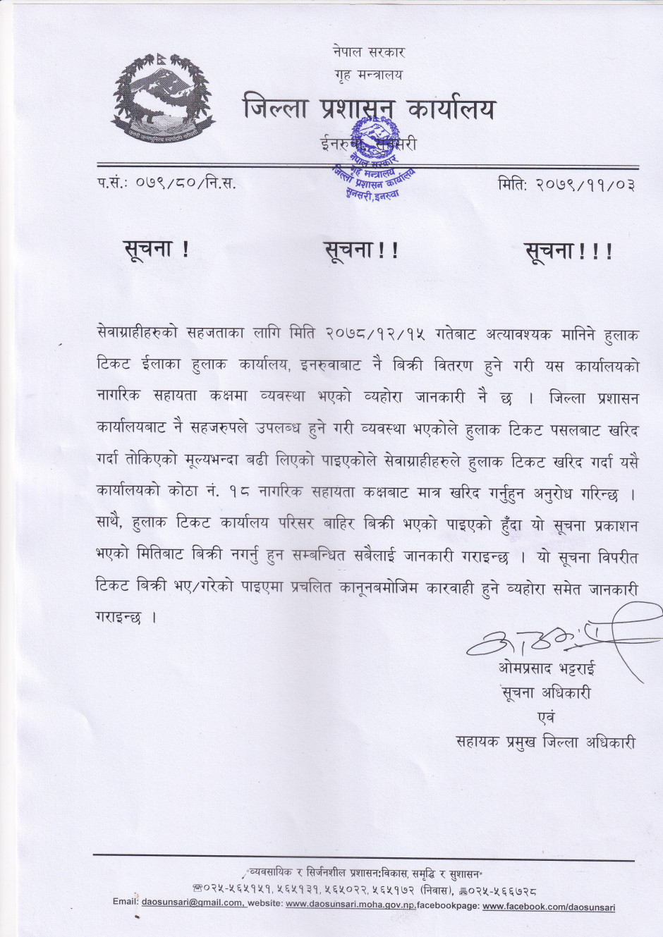 सेवाग्राहीहरुको सहजताका लागि मिति २०७८/१२/१५ गतेबाट अत्यावश्यक मानिने हुलाक टिकट ईलाका हुलाक कार्यालय, इनरुवाबाट नै बिक्री वितरण हुने गरी यस कार्यालयको नागरिक सहायता कक्षमा व्यवस्था भएको व्यहोरा जानकारी नै छ । जिल्ला प्रशासन कार्यालयबाट नै सहजरुपले उपलब्ध हुने गरी व्यवस्था भएकोले हुलाक टिकट पसलबाट खरिद गर्दा तोकिएको मूल्यभन्दा बढी लिएको पाइएकोले सेवाग्राहीहरुले हुलाक टिकट खरिद गर्दा यसै कार्यालयको कोठा नं. 18 नागरिक सहायता कक्षबाट मात्र खरिद गर्नुहुन अनुरोध गरिन्छ । साथै, हुलाक टिकट कार्यालय परिसर बाहिर बिक्री भएको पाइएको हुँदा यो सूचना प्रकाशन भएको मितिबाट बिक्री नगर्नु हुन सम्बन्धित सबैलाई जानकारी गराइन्छ । यो सूचना विपरीत टिकट बिक्री भए/गरेको पाइएमा प्रचलित कानूनबमोजिम कारवाही हुने व्यहोरा समेत जानकारी गराइन्छ ।