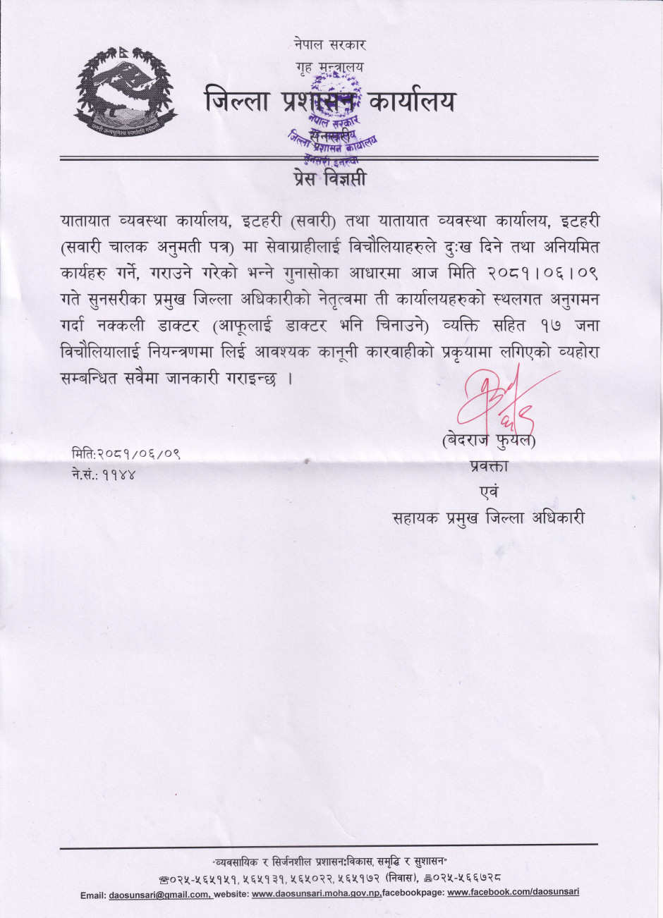 © सर्वाधिकार सुरक्षित जिल्ला प्रशासन कार्यालय, सुनसरी