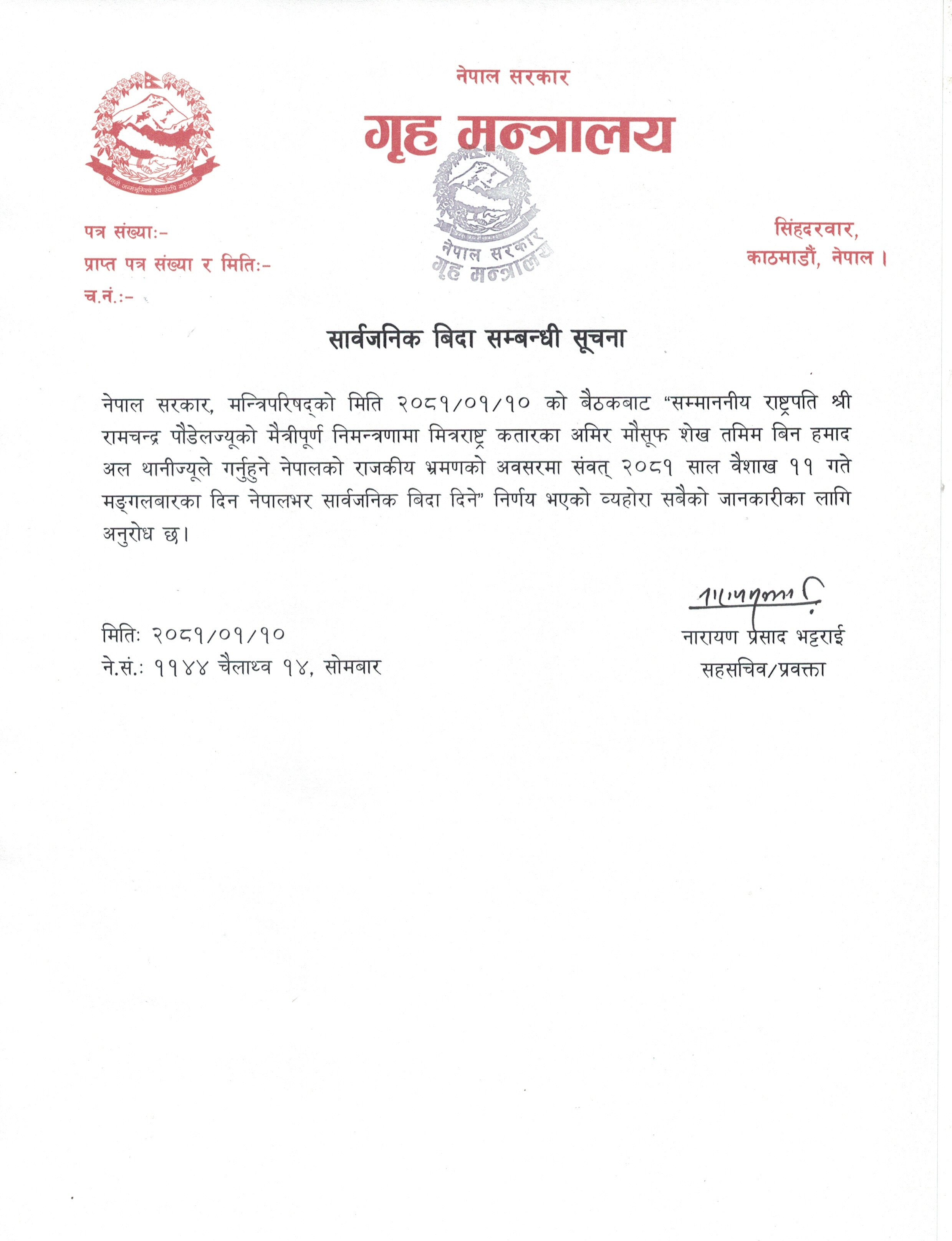 सार्वजनिक बिदा सम्बन्धी सूचना ।