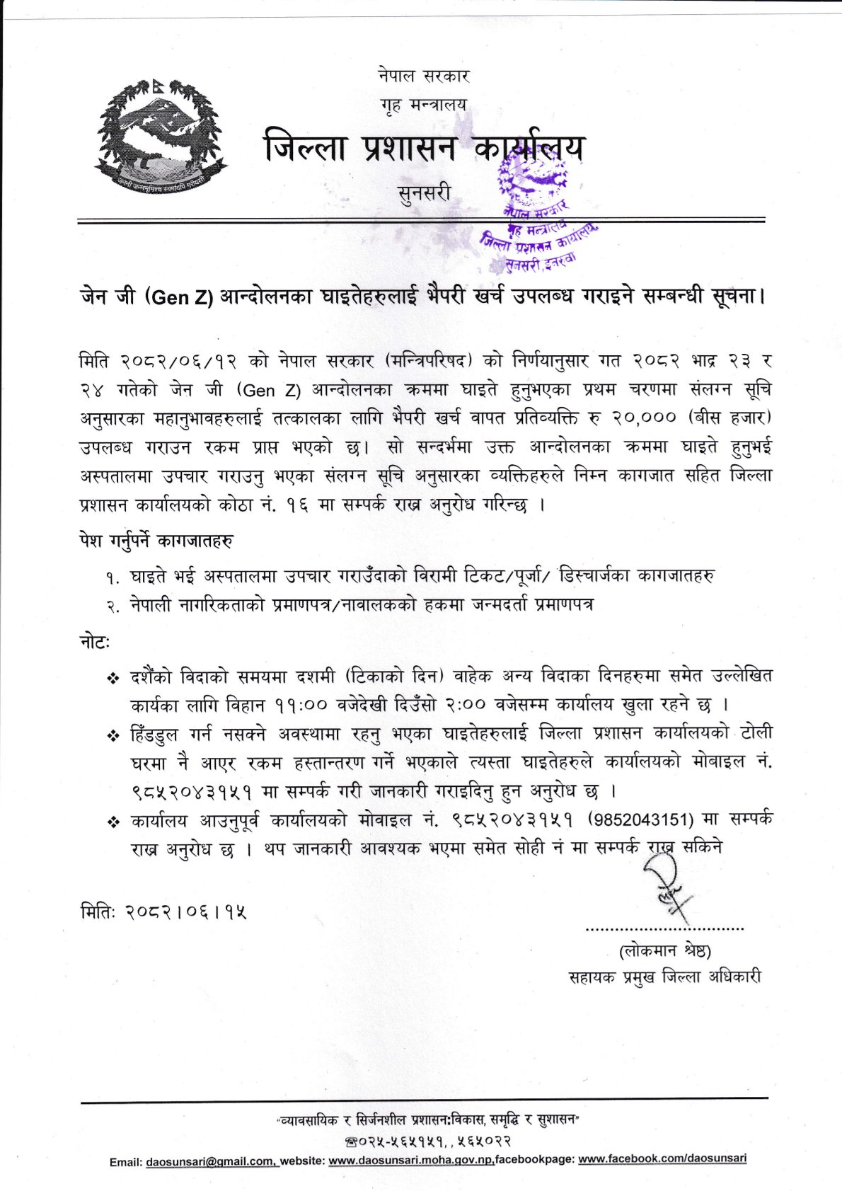 जेन जी (Gen Z) आन्दोलनमा घाइते हुनुभएका संलग्न सूचि (प्रथम चरण) अनुसारका व्यक्तिहरुलाई भैपरी खर्च वितरण हुने सम्बन्धी सूचना ।